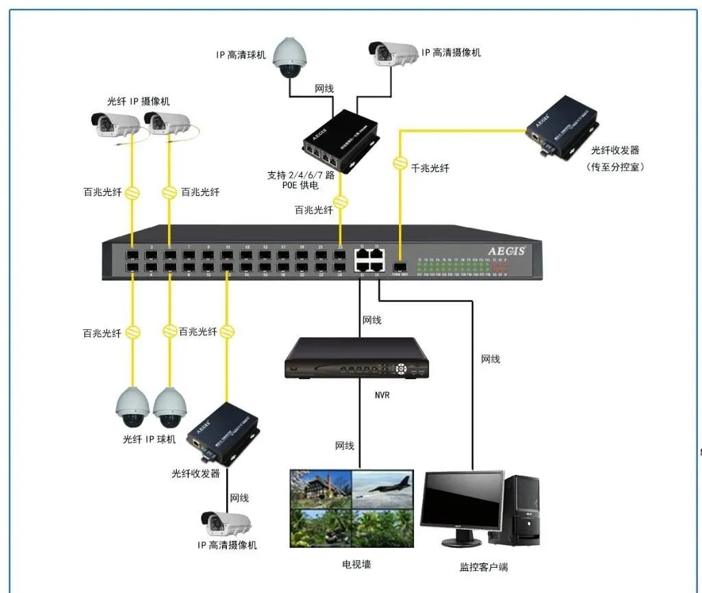三、光纖架構(gòu):網(wǎng)絡(luò)攝像機(jī)+光纖+收發(fā)器
